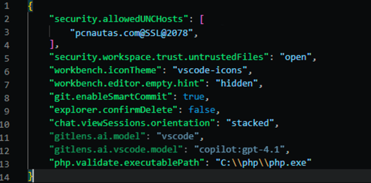 Ctrl + ,para abrir la Configuración. - Haz clic en el icono de la hoja con la flecha (arriba a la derecha) para abrir el archivo settings.json.