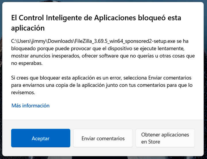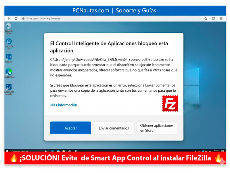 Recientemente, muchos usuarios se han topado con un muro al intentar instalar el popular cliente FTP, FileZilla. Al ejecutar el instalador, Windows despliega un mensaje de Smart App Control (Control Inteligente de Aplicaciones) indicando que la aplicación ha sido bloqueada porque «puede provocar que el dispositivo se ejecute lentamente o mostrar anuncios inesperados».